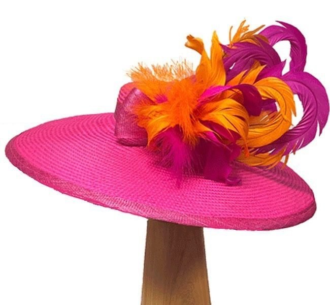 Bright pink orange hat  amply adorned with a large spray of pink and orange feathers and finished with a large sinamay bow. The crown has a modern low profile for a true chic look. Wear for the derby and other races, and for church, cocktail, weddings and other dress events.