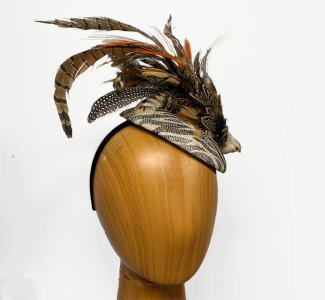 For the most flattering look, I suggest positioning this brown print fascinator slightly down on the left side of your head.