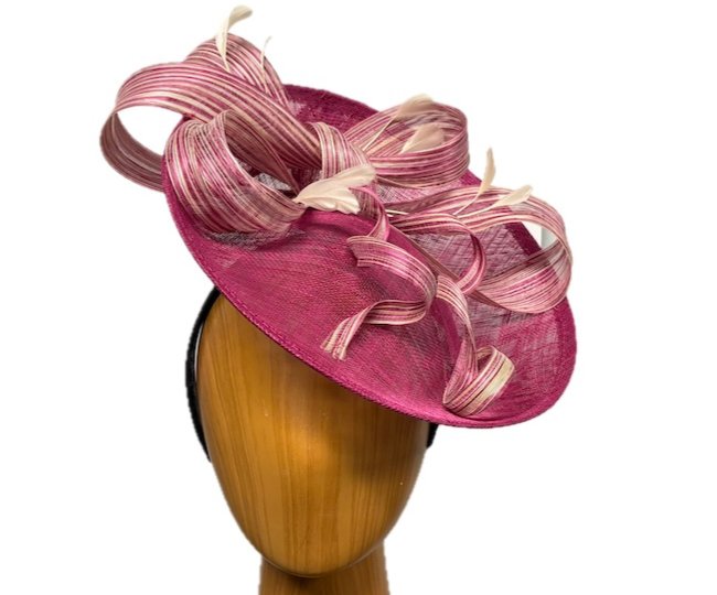 Dana is a raspberry ivory swirl fascinator adorned with sweeping swirls of striped Jinsin material and a sprinkling of ivory curled feathers. This unique and versatile raspberry fascinator is perfect for so many occasions — the derby and other races, for cocktail, weddings, church and other dress events.