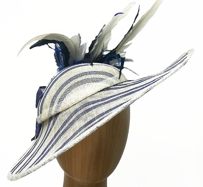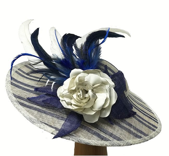Claire is an ivory navy stripe fascinator adorned with a large silk flower, sinamay “leaves”, and multiple white and blue feathers. Along with the striped fabric, this ivory fascinator makes a lovely and unique topper. Confidently wear for the derby and other races, and for cocktail, weddings and other dress events.