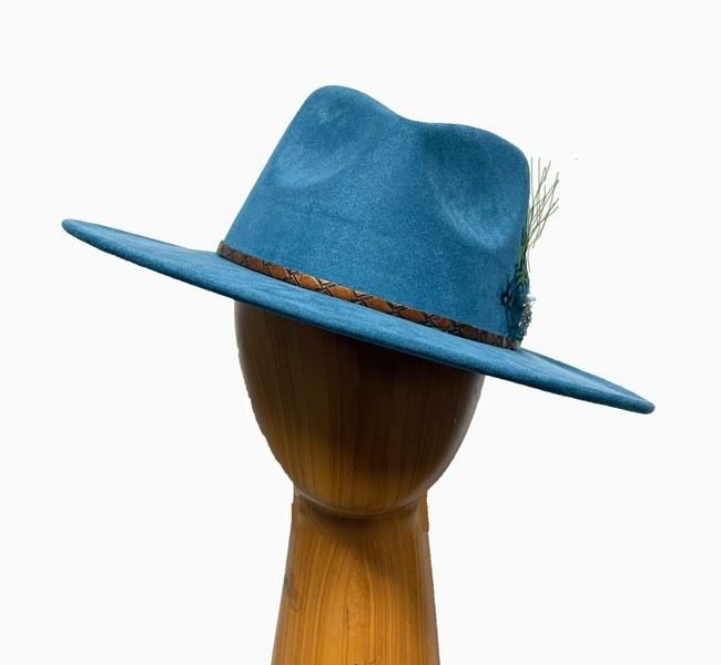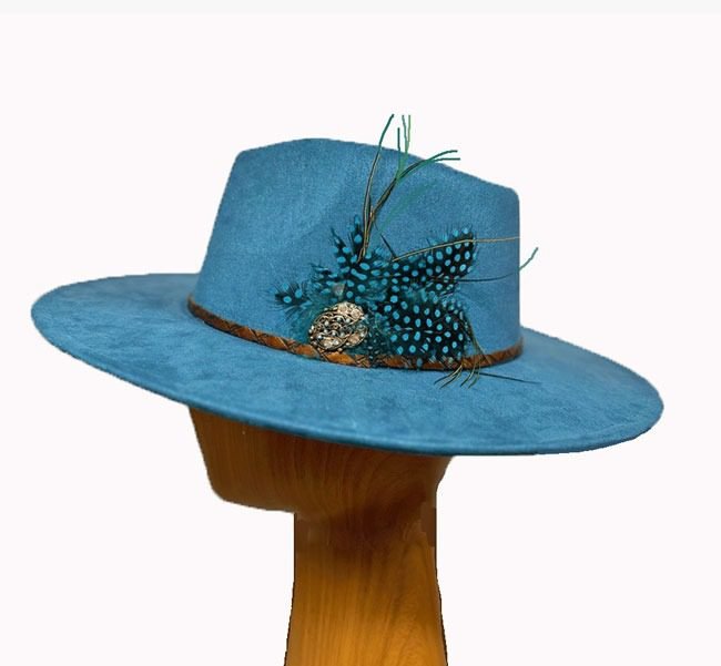 Jude is a teal wool casual hat simply adorned with a coppery leather band and small feathers. Confidently wear this teal hat for the derby and other races, and for church and other dress and dress casual events.