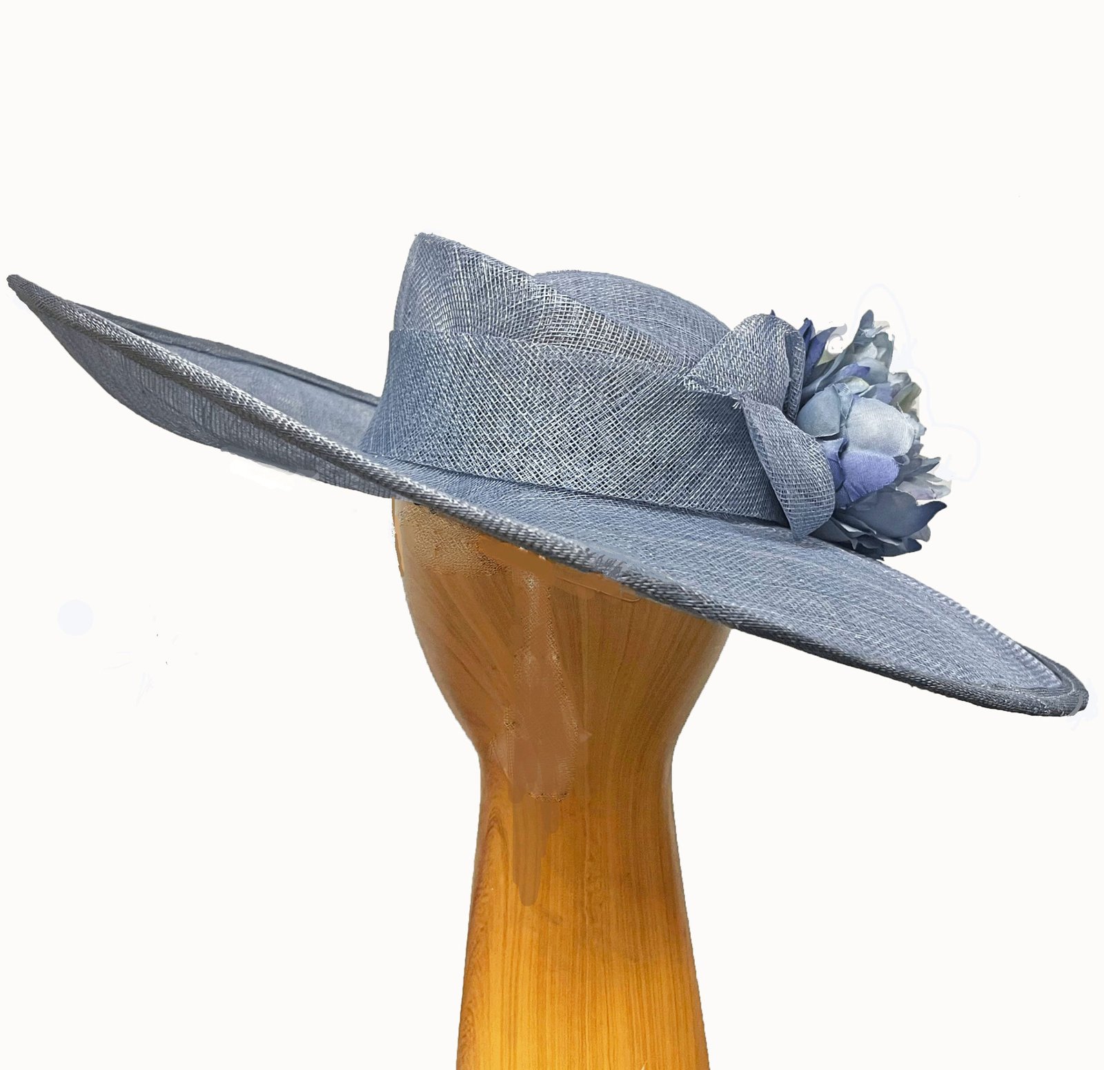 Light blue flowers hat adorned with matching silk flowers and simanay leaves. The crown and brim each have unique contours . Wear for the derby and other races, and for church, cocktail, weddings and other dress events.