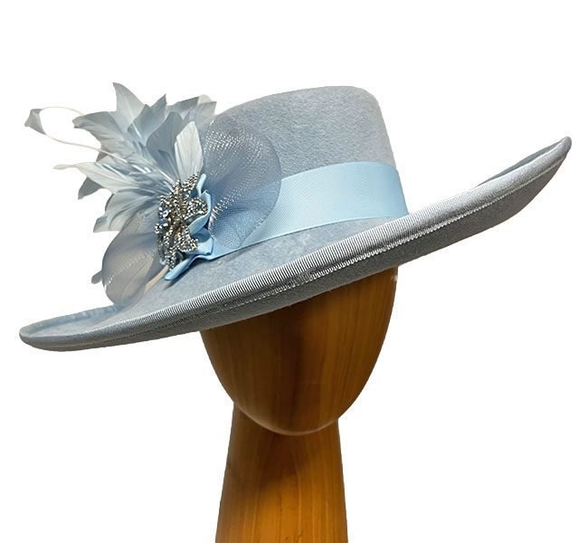 Jocelyn is a light blue wool hat adorned with a matching feather spray and crinoline trim. The brim is nicely curved. This is a beautiful and luxurious wool hat! Confidently wear this wool hat for the cool weather races, and for church, cocktail, weddings and other dress events.
