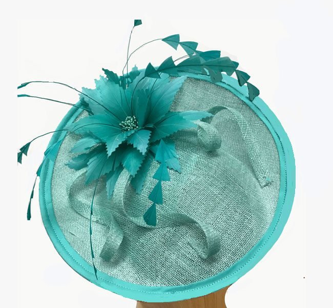 Patrice medium aqua feather fascinator. This lovely fascinator is adorned with a large spray of matching feathers. Wear this aqua fascinator for the derby and other races, dress, weddings, cocktail or other events.