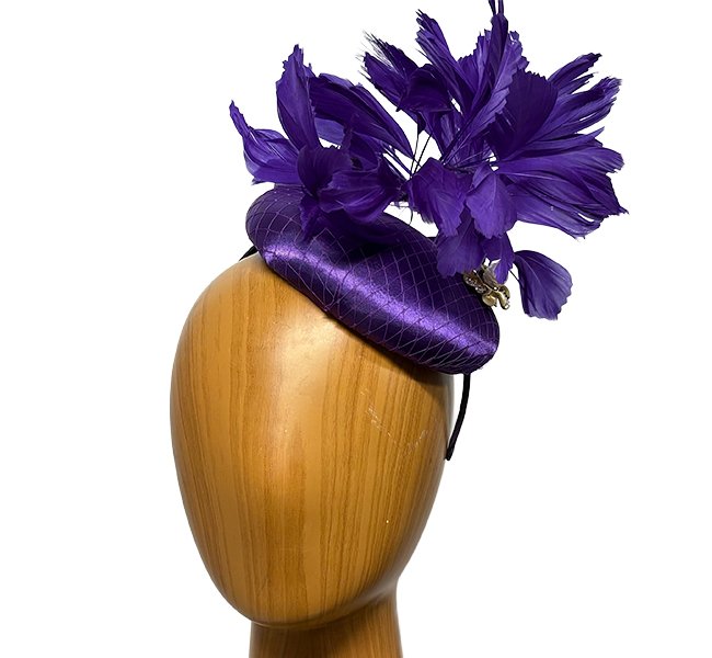 Mikkey is a purple feathered satin fascinator. The base for this lovely small purple hat is covered with satin and matching netting, and then adorned with a spray of deep purple feathers and a gold brooch. This purple fascinator is perfect for the derby and other races, and especially for cocktail, weddings and other dress events.