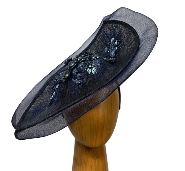 Scarlett is a navy lace applique’ fascinator.  This unique fascinator has a very structured and “curvy” shape that makes a statement on its own!  The front surface of this navy fascinator displays the hand sewn navy silk flower embroidery.  The rim of the entire fascinator is trimmed in folded crinoline.  A very elegant look! Confidently wear this navy lace applique’ fascinator for the derby and other races, for church , evening parties, cocktails and other dress  events.