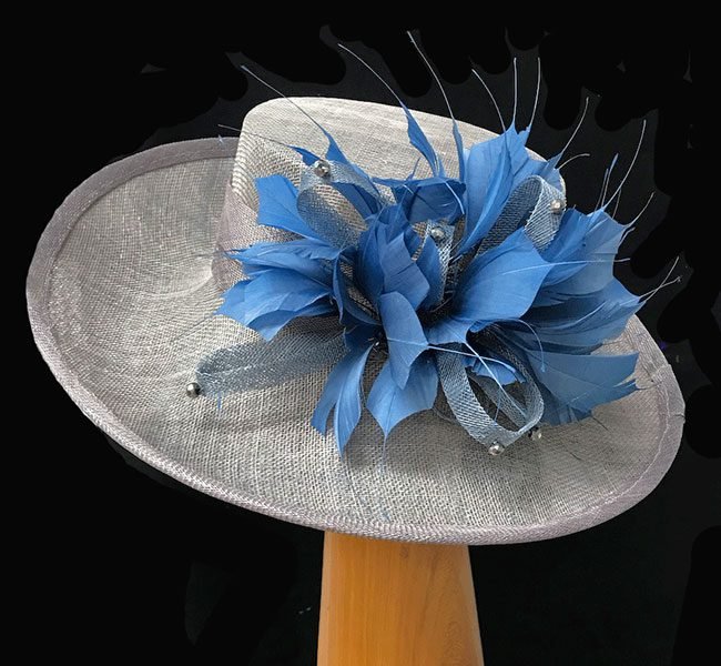 Caroline is a steel blue feathers hat that is adorned with a large feather flower and sinamay ribbons. The brim has a lovely curvy shape. Confidently wear this beautiful steel blue hat for the derby and other races, and for church, cocktail, weddings and other dress events.
