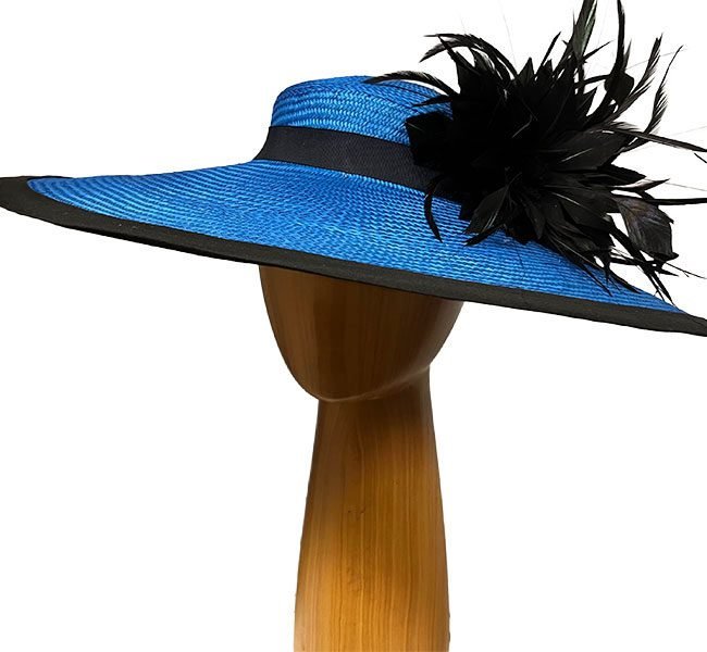 Becky is a XL blue buntal hat – a stunning dress hat both in color and design. It is amply adorned with a large black feather flower. The crown has a modern low profile for a true chic look. Confidently wear this XL blue hat for the derby and other races, and for church, cocktail, weddings and other dress events.