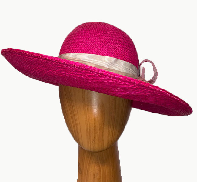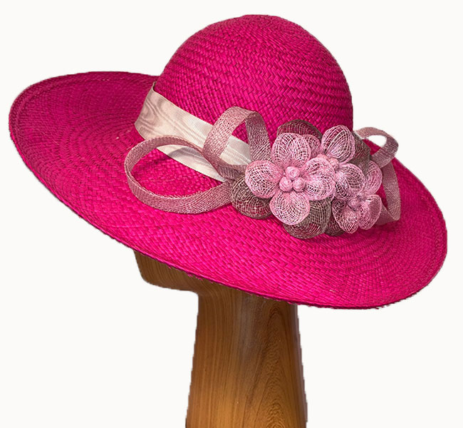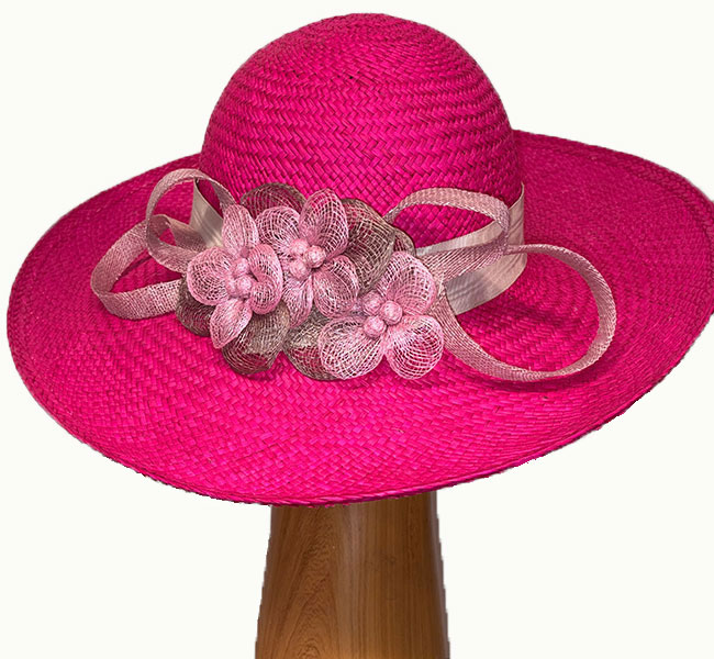 Mia is a bright pink straw hat adorned with lighter pink and grey sinamay flowers and curls. This is a bright and colorful summer hat, a cut above the ordinary summer sun hat! Wear this pink straw hat for dress casual and casual occasions, and sun protection throughout the spring and summer months.