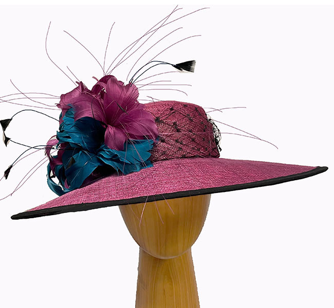 Chloe is a raspberry teal feathers hat adorned with black netting, and large teal and raspberry wine colored feather sprays. This is a stunning jewel tone dress hat. Confidently wear this raspberry hat for the derby and other races, and for church, cocktail, weddings and other dress events.